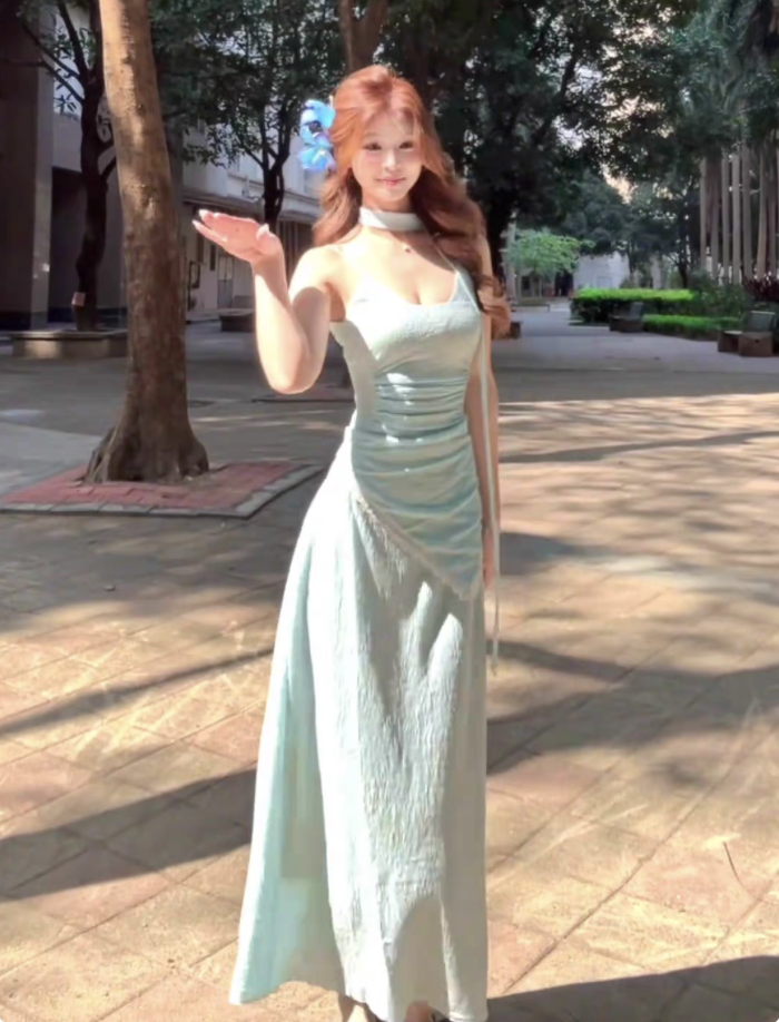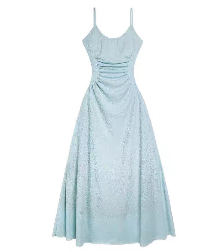 海边度假法式蓝色吊带连衣裙女夏季修身沙滩裙性感纯欲绝美长裙子