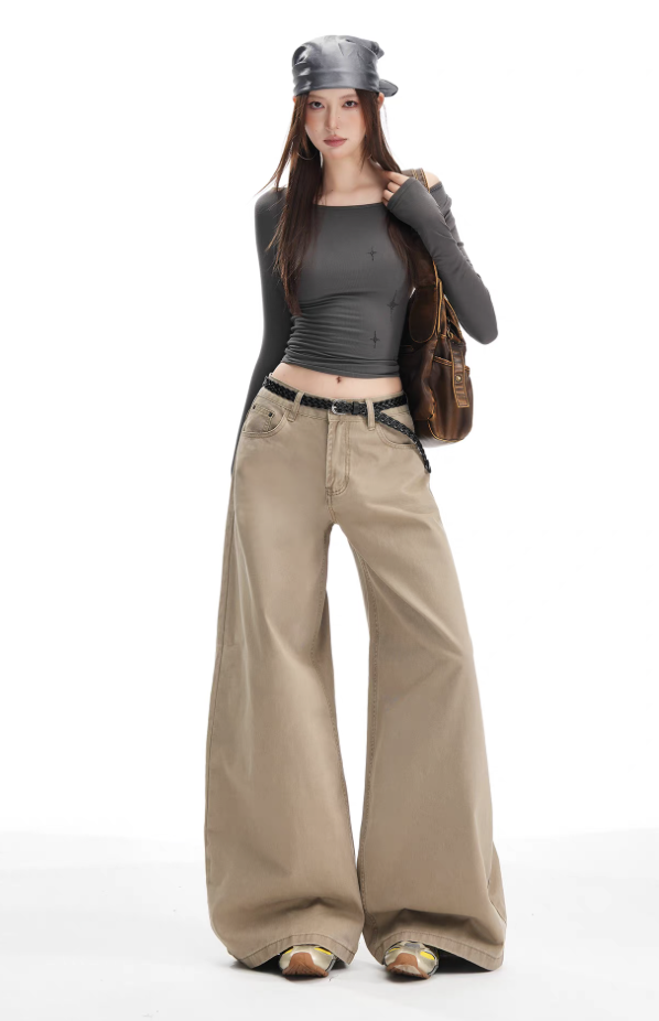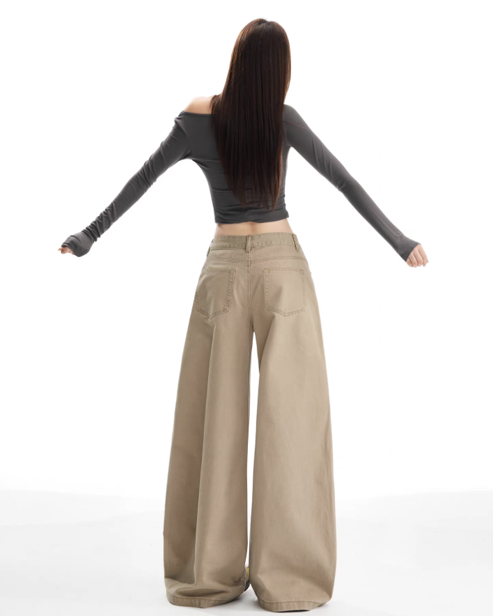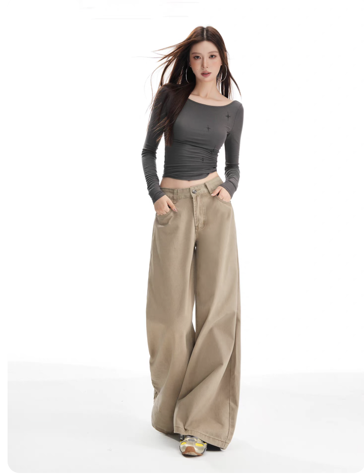 弄格卡其色高腰直筒牛仔裤女加绒冬季百搭宽松显瘦阔腿休闲长裤子