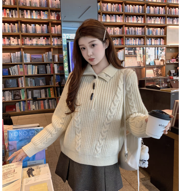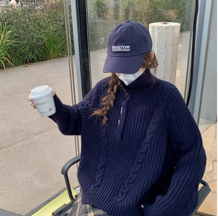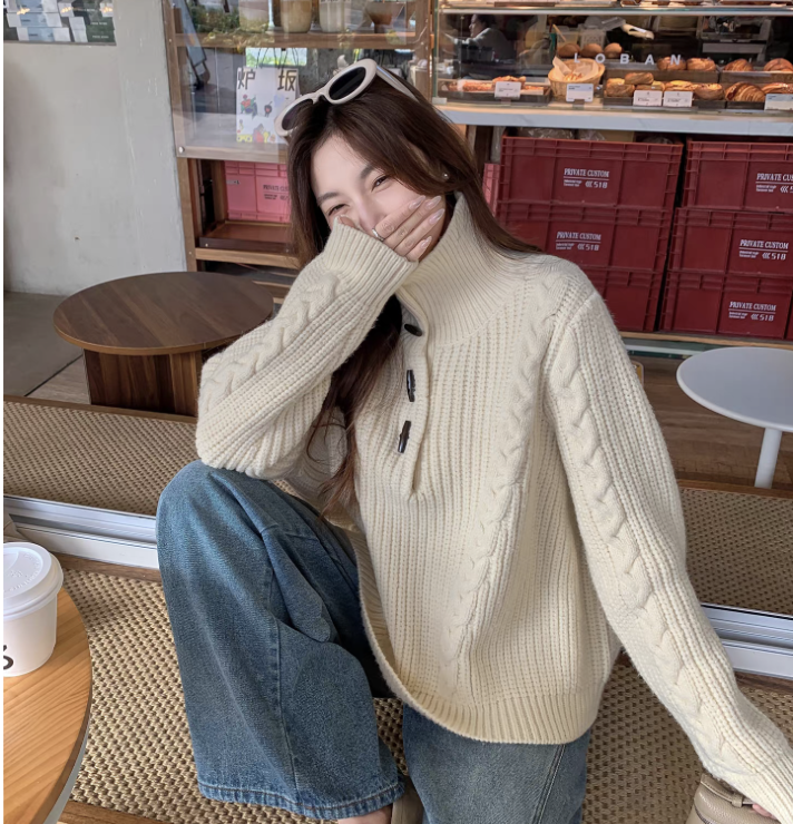 马西西大码女装重工绞花牛角扣高领毛衣冬季胖mm宽松显瘦针织上衣