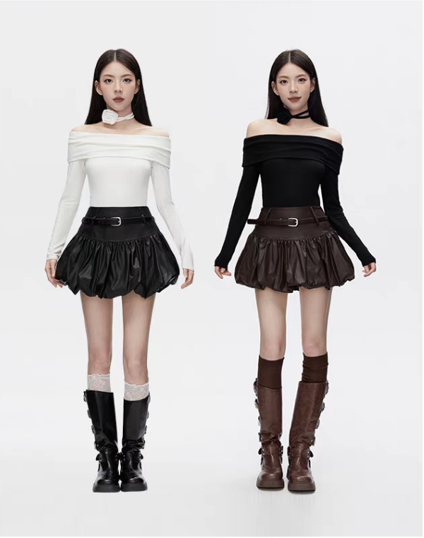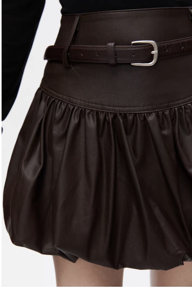 VIVICATHY2026春季美式辣妹高腰花苞皮裙女褶皱蓬蓬显瘦a字半身裙